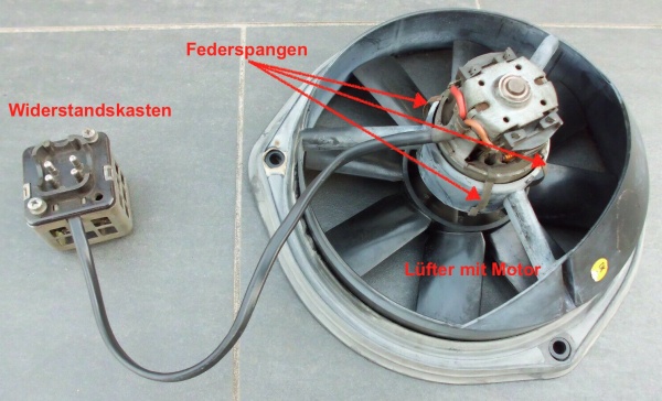 | Der Lüftermotor sieht mitsamt zugehörigem Kabel und Widerstandsbox in etwa so aus (abgebildet ist eine sehr frühe Version): | Der Lüftermotor sieht mitsamt zugehörigem Kabel und Widerstandsbox in etwa so aus (abgebildet ist eine sehr frühe Version): | ||