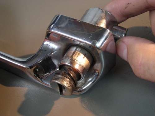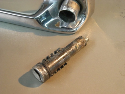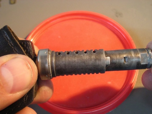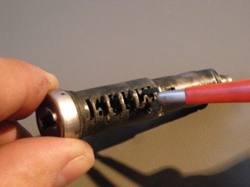 Jetzt kann der komplette Schließzylinder von hinten nach vorne vorsichtig herausgedrückt werden. Auch wenn ich es hier nicht gemacht habe: das Beste ist, wenn der Schlüssel vorher eingesteckt wird. Dadurch werden die Schliessplättchen in die richtige Position gedrückt, damit man den Zylinder auch ein wenig drehen kann. Ausserdem können die Plättchen einem nicht um die Ohren fliegen, wenn der Zylinder draussen ist, da sie vom Schlüssel festgehalten werden.