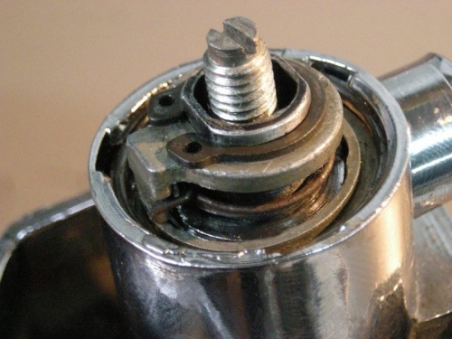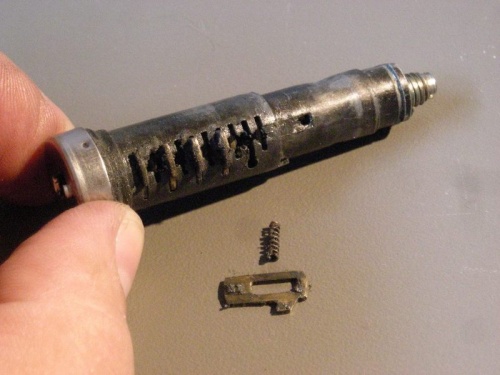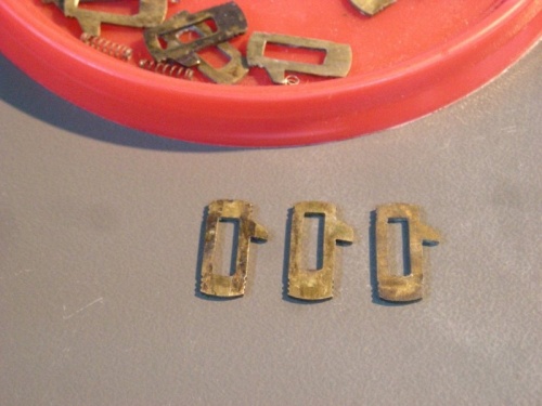 Hier eines der Plättchen mit der zugehörigen Feder. Der Dreck besteht u.a. aus altem Fett, der sich im Laufe der Jahrzehnte verfestigt hat. Dadurch wird die eigentliche Funktion der Federn eingeschränkt. Die Plättchen laufen dann auch nicht richtig, das Schloss hakt.