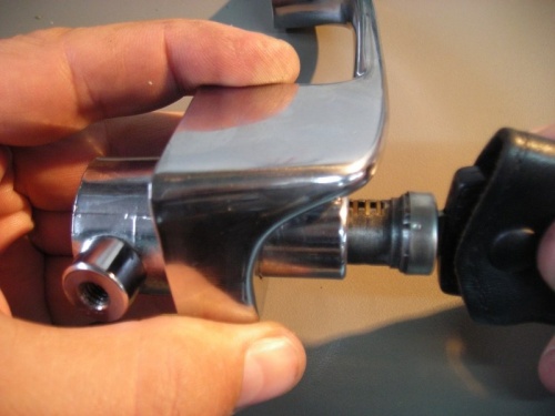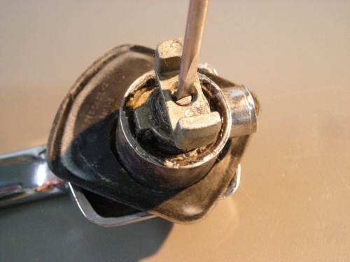 Nun drehen wir die Schraube hinein (im Uhrzeigersinn). Der U-förmige Mitnehmer wandert dadurch nach oben, die Schraube versinkt in der Öffnung. Zu beachten wäre, dass der Schraubendreher entsprechend schlank sein sollte, damit dieser in die Öffnung passt.