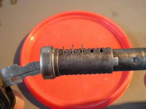 Wenn nun der (richtige) Schlüssel drinnen steckt, kann der Zylinder gedreht und die Türe entsprechend geöffnet werden. Sollten die Plättchen mal herausfallen, ohne dass die zugehörige Position markiert wurde, dann ist das auch kein Beinbruch. Man kann dann durch Probieren versuchen die Position zu finden. Es ist aber eine mühselige Puzzlearbeit.