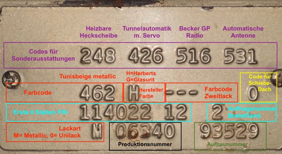 Das gezeigte Beispiel steht mit 114022 für W114, 250 CE, die nachfolgende 1 für Linkslenker und die weitere 2 für Automatik-Getriebe.
