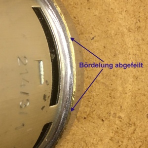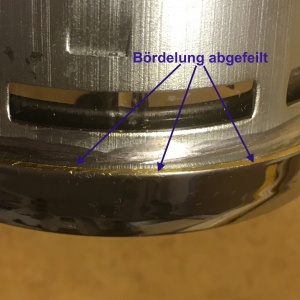 Man kann den Chromring auch lösen, indem man ringsum die Bördelung abfeilt. Das ist eine etwas mühselige Arbeit und erfordert Ausdauer.
