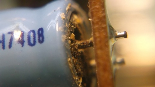 _______Detailbild für ausgetrockneten Elko mit tlw. ausgetretenem und getrocknetem Elektrolyt