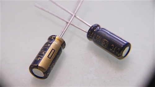 _______Die neuen Elkos (bei dem Elko links im Bild sieht man den längsseitigen Minusbalken mit dem "-" Zeichen drauf)