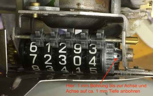 Diese filigrane Bohrung geht am besten, wenn der Bohrer in einen Dremel eingesetzt ist. Während des Bohrens sollte das Zahnrad z.B. mittels Pinzette gegen Wegdrehen fixiert sein.