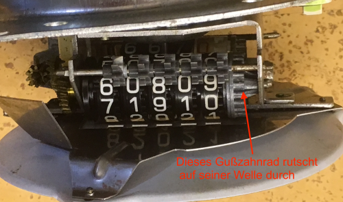 Ursache ist das graue Gußzahnrad des Gesamtkilometerzählers, das im Fehlerfall keine kraftschlüssige Verbindung mehr zu seiner Antriebswelle hat.