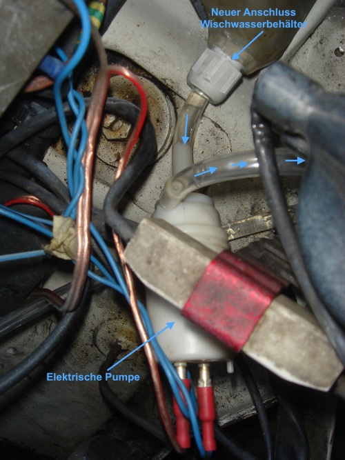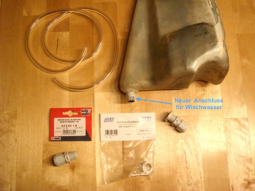 Wenn man eine selbst ansaugende W116-er Pumpe auftreiben kann, kann man sich das Loch und alles sparen. Diese Pumpe kann man einfach zwischen Schlauch vom Deckel des Behälters und Schlauch Richtung Düsen stecken.